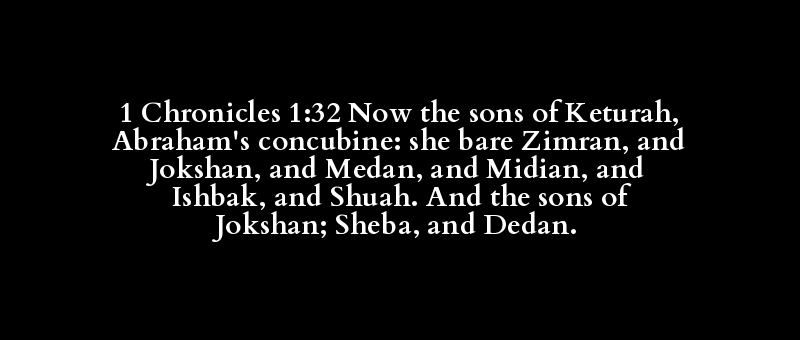 1 Chronicles 1:32 Now the sons of Keturah, Abraham's concubine: she bare Zimran, and Jokshan, and Medan, and Midian, and Ishbak, and Shuah. And the sons of Jokshan; Sheba, and Dedan.