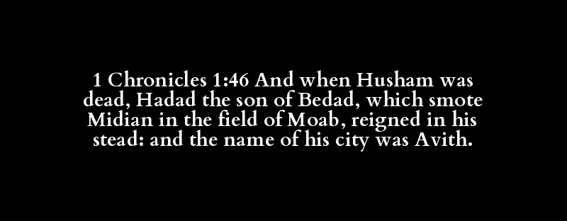 1 Chronicles 1:46 And when Husham was dead, Hadad the son of Bedad, which smote Midian in the field of Moab, reigned in his stead: and the name of his city was Avith.