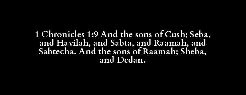 1 Chronicles 1:9 And the sons of Cush; Seba, and Havilah, and Sabta, and Raamah, and Sabtecha. And the sons of Raamah; Sheba, and Dedan.