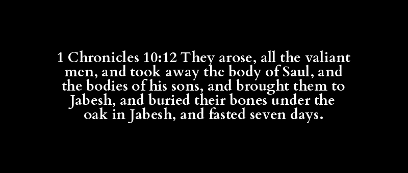 1 Chronicles 10:12 They arose, all the valiant men, and took away the body of Saul, and the bodies of his sons, and brought them to Jabesh, and buried their bones under the oak in Jabesh, and fasted seven days.