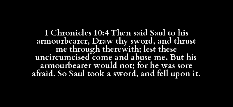 1 Chronicles 10:4 Then said Saul to his armourbearer, Draw thy sword, and thrust me through therewith; lest these uncircumcised come and abuse me. But his armourbearer would not; for he was sore afraid. So Saul took a sword, and fell upon it.