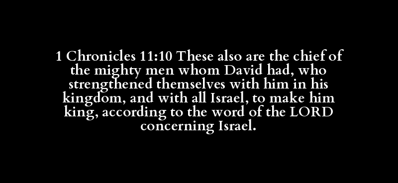 1 Chronicles 11:10 These also are the chief of the mighty men whom David had, who strengthened themselves with him in his kingdom, and with all Israel, to make him king, according to the word of the LORD concerning Israel.