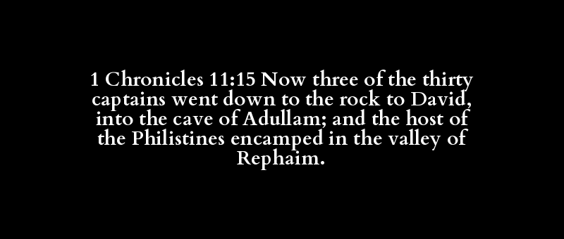 1 Chronicles 11:15 Now three of the thirty captains went down to the rock to David, into the cave of Adullam; and the host of the Philistines encamped in the valley of Rephaim.