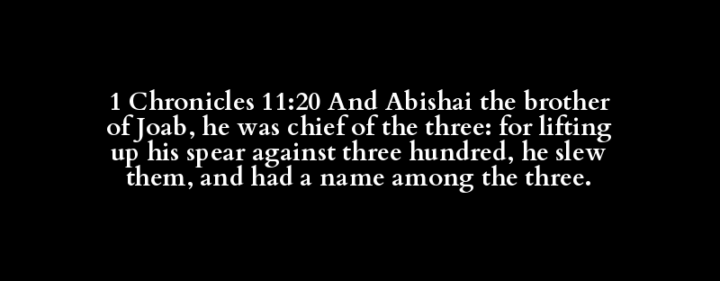 1 Chronicles 11:20 And Abishai the brother of Joab, he was chief of the three: for lifting up his spear against three hundred, he slew them, and had a name among the three.