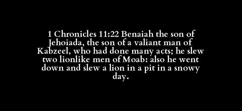 1 Chronicles 11:22 Benaiah the son of Jehoiada, the son of a valiant man of Kabzeel, who had done many acts; he slew two lionlike men of Moab: also he went down and slew a lion in a pit in a snowy day.