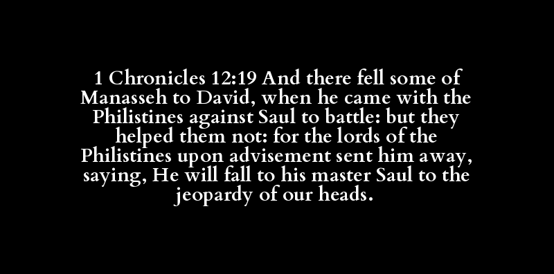 1 Chronicles 12:19 And there fell some of Manasseh to David, when he came with the Philistines against Saul to battle: but they helped them not: for the lords of the Philistines upon advisement sent him away, saying, He will fall to his master Saul to the jeopardy of our heads.