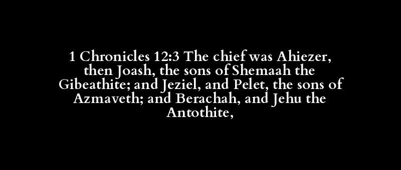 1 Chronicles 12:3 The chief was Ahiezer, then Joash, the sons of Shemaah the Gibeathite; and Jeziel, and Pelet, the sons of Azmaveth; and Berachah, and Jehu the Antothite,
