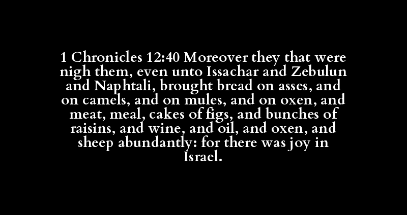 1 Chronicles 12:40 Moreover they that were nigh them, even unto Issachar and Zebulun and Naphtali, brought bread on asses, and on camels, and on mules, and on oxen, and meat, meal, cakes of figs, and bunches of raisins, and wine, and oil, and oxen, and sheep abundantly: for there was joy in Israel.