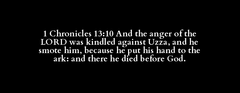 1 Chronicles 13:10 And the anger of the LORD was kindled against Uzza, and he smote him, because he put his hand to the ark: and there he died before God.