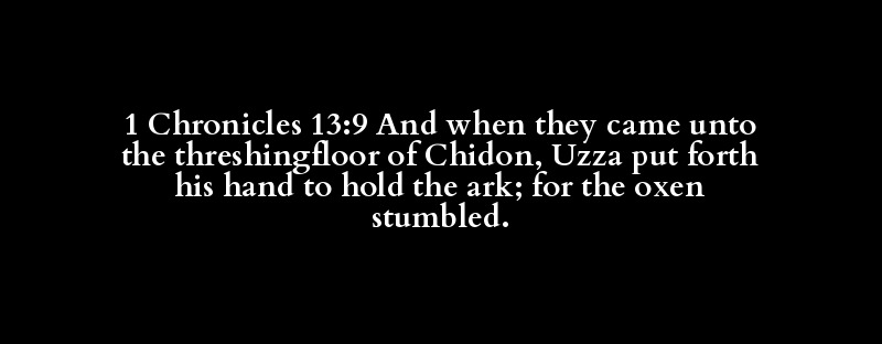 1 Chronicles 13:9 And when they came unto the threshingfloor of Chidon, Uzza put forth his hand to hold the ark; for the oxen stumbled.