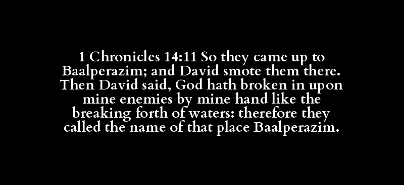 1 Chronicles 14:11 So they came up to Baalperazim; and David smote them there. Then David said, God hath broken in upon mine enemies by mine hand like the breaking forth of waters: therefore they called the name of that place Baalperazim.