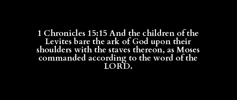1 Chronicles 15:15 And the children of the Levites bare the ark of God upon their shoulders with the staves thereon, as Moses commanded according to the word of the LORD.
