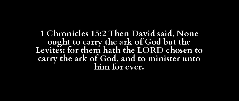 1 Chronicles 15:2 Then David said, None ought to carry the ark of God but the Levites: for them hath the LORD chosen to carry the ark of God, and to minister unto him for ever.