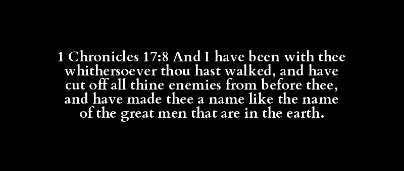 1 Chronicles 17:8 And I have been with thee whithersoever thou hast walked, and have cut off all thine enemies from before thee, and have made thee a name like the name of the great men that are in the earth.