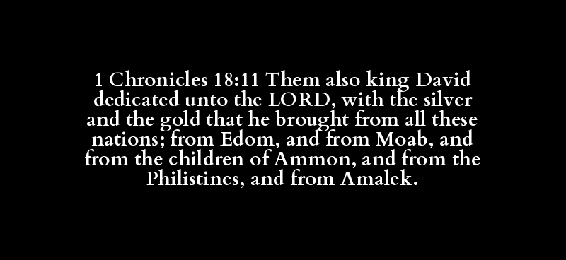 1 Chronicles 18:11 Them also king David dedicated unto the LORD, with the silver and the gold that he brought from all these nations; from Edom, and from Moab, and from the children of Ammon, and from the Philistines, and from Amalek.