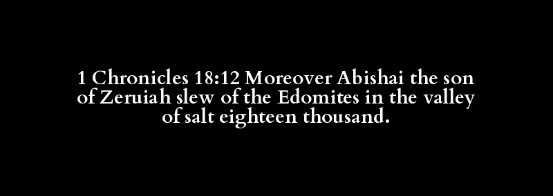 1 Chronicles 18:12 Moreover Abishai the son of Zeruiah slew of the Edomites in the valley of salt eighteen thousand.