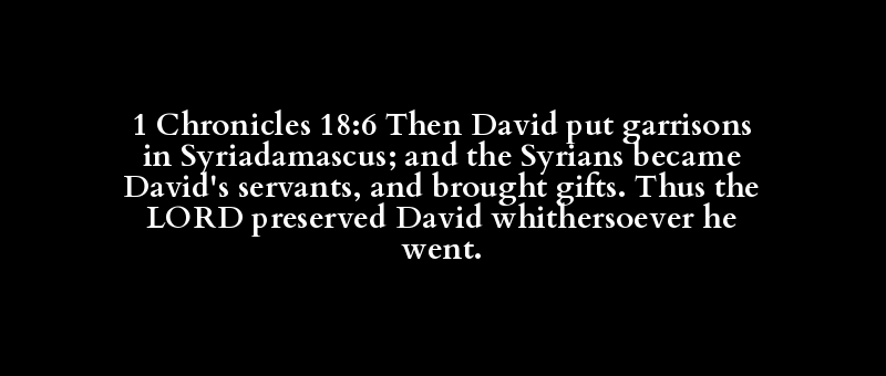 1 Chronicles 18:6 Then David put garrisons in Syriadamascus; and the Syrians became David's servants, and brought gifts. Thus the LORD preserved David whithersoever he went.