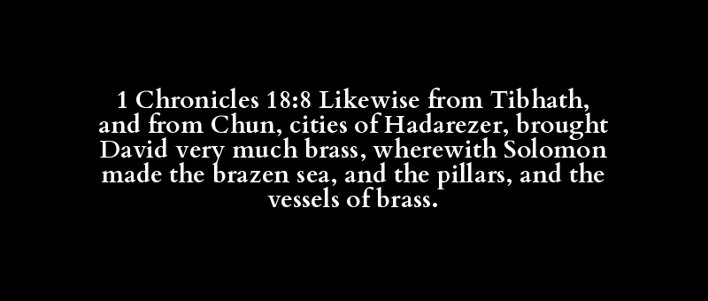 1 Chronicles 18:8 Likewise from Tibhath, and from Chun, cities of Hadarezer, brought David very much brass, wherewith Solomon made the brazen sea, and the pillars, and the vessels of brass.