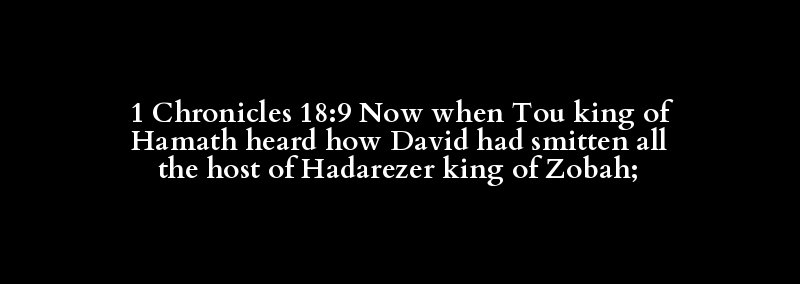 1 Chronicles 18:9 Now when Tou king of Hamath heard how David had smitten all the host of Hadarezer king of Zobah;
