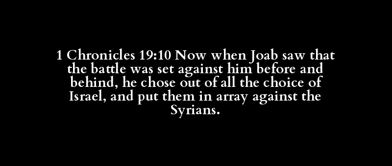 1 Chronicles 19:10 Now when Joab saw that the battle was set against him before and behind, he chose out of all the choice of Israel, and put them in array against the Syrians.