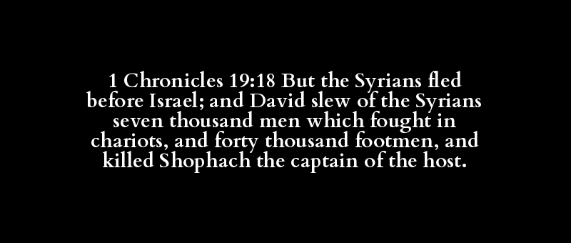1 Chronicles 19:18 But the Syrians fled before Israel; and David slew of the Syrians seven thousand men which fought in chariots, and forty thousand footmen, and killed Shophach the captain of the host.