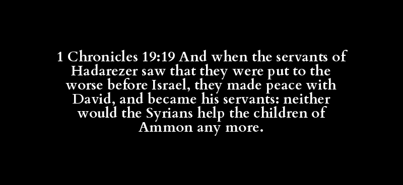 1 Chronicles 19:19 And when the servants of Hadarezer saw that they were put to the worse before Israel, they made peace with David, and became his servants: neither would the Syrians help the children of Ammon any more.