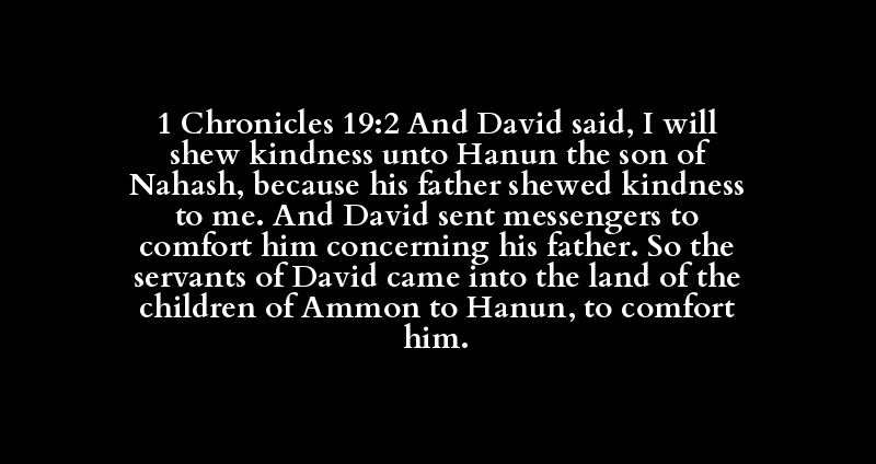 1 Chronicles 19:2 And David said, I will shew kindness unto Hanun the son of Nahash, because his father shewed kindness to me. And David sent messengers to comfort him concerning his father. So the servants of David came into the land of the children of Ammon to Hanun, to comfort him.