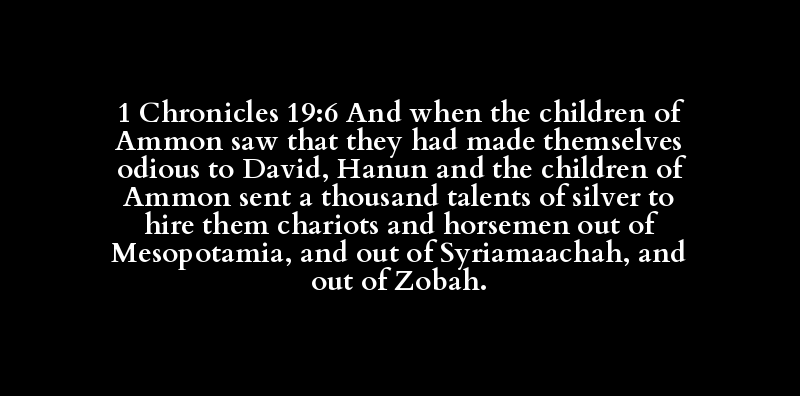 1 Chronicles 19:6 And when the children of Ammon saw that they had made themselves odious to David, Hanun and the children of Ammon sent a thousand talents of silver to hire them chariots and horsemen out of Mesopotamia, and out of Syriamaachah, and out of Zobah.