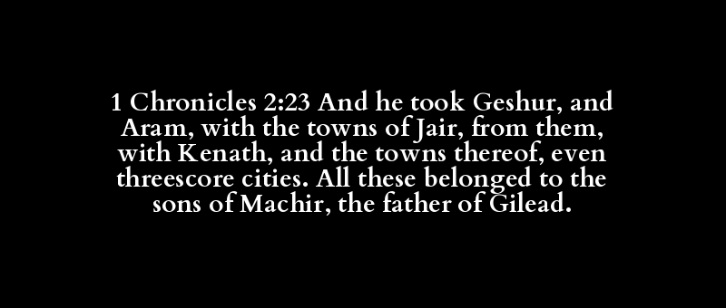 1 Chronicles 2:23 And he took Geshur, and Aram, with the towns of Jair, from them, with Kenath, and the towns thereof, even threescore cities. All these belonged to the sons of Machir, the father of Gilead.