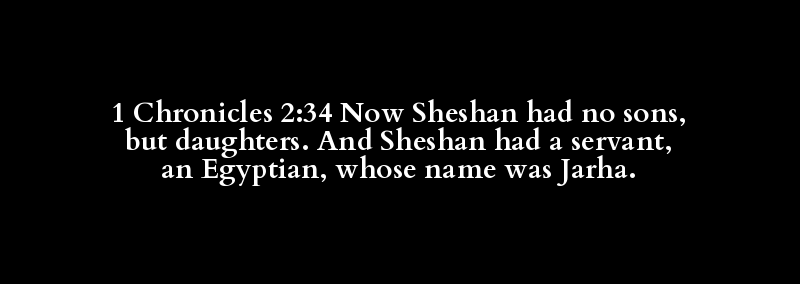 1 Chronicles 2:34 Now Sheshan had no sons, but daughters. And Sheshan had a servant, an Egyptian, whose name was Jarha.