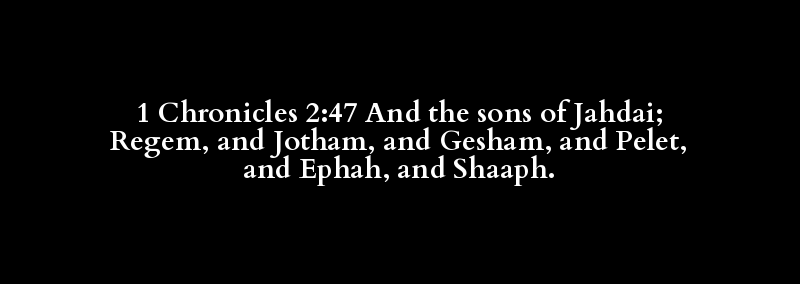 1 Chronicles 2:47 And the sons of Jahdai; Regem, and Jotham, and Gesham, and Pelet, and Ephah, and Shaaph.
