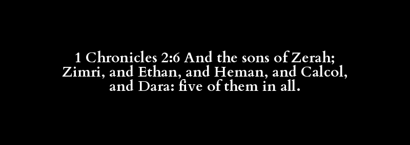 1 Chronicles 2:6 And the sons of Zerah; Zimri, and Ethan, and Heman, and Calcol, and Dara: five of them in all.