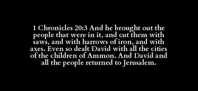 1 Chronicles 20:3 And he brought out the people that were in it, and cut them with saws, and with harrows of iron, and with axes. Even so dealt David with all the cities of the children of Ammon. And David and all the people returned to Jerusalem.