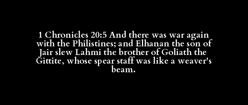 1 Chronicles 20:5 And there was war again with the Philistines; and Elhanan the son of Jair slew Lahmi the brother of Goliath the Gittite, whose spear staff was like a weaver's beam.