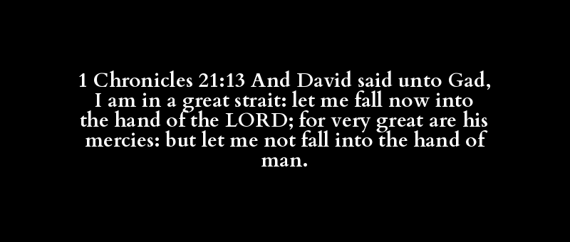 1 Chronicles 21:13 And David said unto Gad, I am in a great strait: let me fall now into the hand of the LORD; for very great are his mercies: but let me not fall into the hand of man.