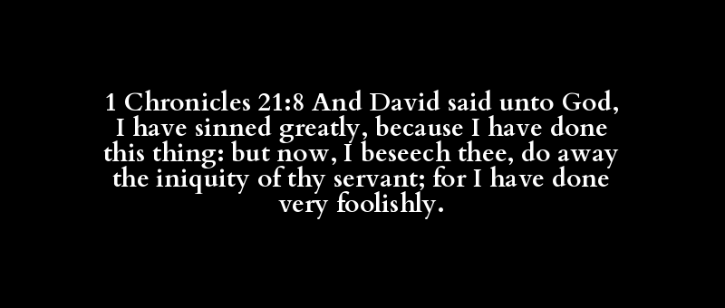 1 Chronicles 21:8 And David said unto God, I have sinned greatly, because I have done this thing: but now, I beseech thee, do away the iniquity of thy servant; for I have done very foolishly.