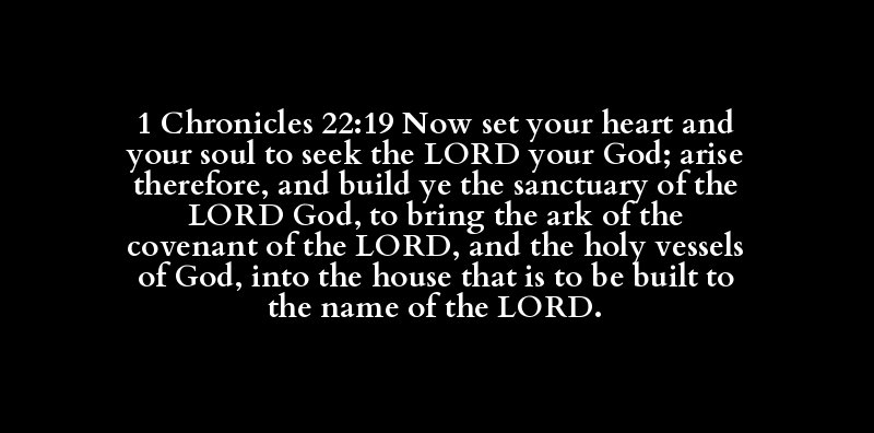 1 Chronicles 22:19 Now set your heart and your soul to seek the LORD your God; arise therefore, and build ye the sanctuary of the LORD God, to bring the ark of the covenant of the LORD, and the holy vessels of God, into the house that is to be built to the name of the LORD.