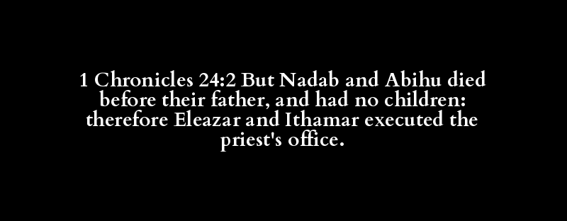 1 Chronicles 24:2 But Nadab and Abihu died before their father, and had no children: therefore Eleazar and Ithamar executed the priest's office.