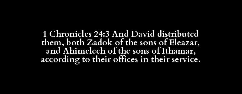 1 Chronicles 24:3 And David distributed them, both Zadok of the sons of Eleazar, and Ahimelech of the sons of Ithamar, according to their offices in their service.