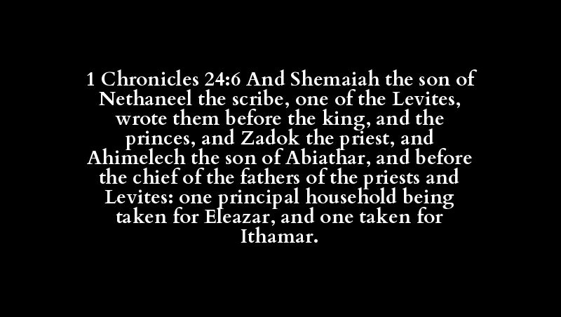 1 Chronicles 24:6 And Shemaiah the son of Nethaneel the scribe, one of the Levites, wrote them before the king, and the princes, and Zadok the priest, and Ahimelech the son of Abiathar, and before the chief of the fathers of the priests and Levites: one principal household being taken for Eleazar, and one taken for Ithamar.