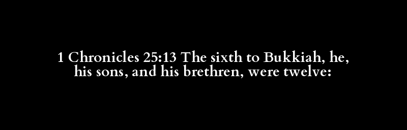 1 Chronicles 25:13 The sixth to Bukkiah, he, his sons, and his brethren, were twelve: