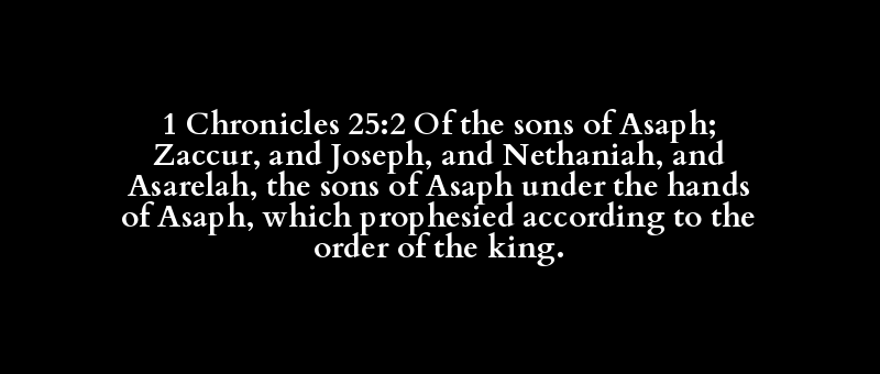 1 Chronicles 25:2 Of the sons of Asaph; Zaccur, and Joseph, and Nethaniah, and Asarelah, the sons of Asaph under the hands of Asaph, which prophesied according to the order of the king.