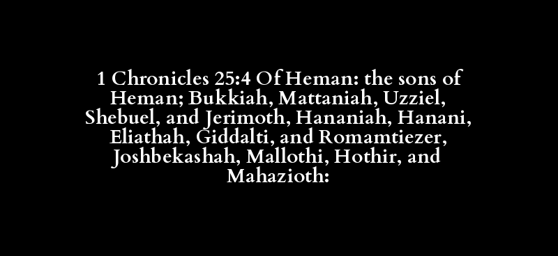 1 Chronicles 25:4 Of Heman: the sons of Heman; Bukkiah, Mattaniah, Uzziel, Shebuel, and Jerimoth, Hananiah, Hanani, Eliathah, Giddalti, and Romamtiezer, Joshbekashah, Mallothi, Hothir, and Mahazioth: