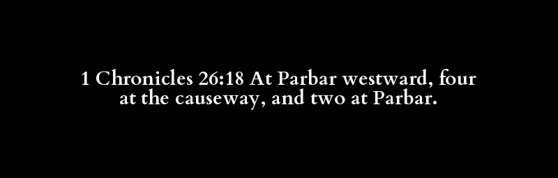 1 Chronicles 26:18 At Parbar westward, four at the causeway, and two at Parbar.