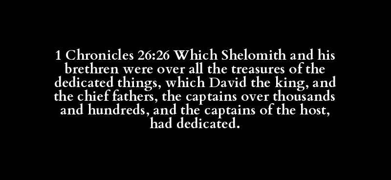 1 Chronicles 26:26 Which Shelomith and his brethren were over all the treasures of the dedicated things, which David the king, and the chief fathers, the captains over thousands and hundreds, and the captains of the host, had dedicated.