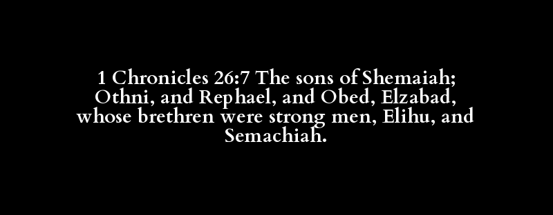 1 Chronicles 26:7 The sons of Shemaiah; Othni, and Rephael, and Obed, Elzabad, whose brethren were strong men, Elihu, and Semachiah.
