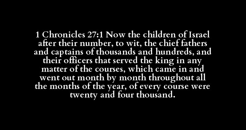 1 Chronicles 27:1 Now the children of Israel after their number, to wit, the chief fathers and captains of thousands and hundreds, and their officers that served the king in any matter of the courses, which came in and went out month by month throughout all the months of the year, of every course were twenty and four thousand.