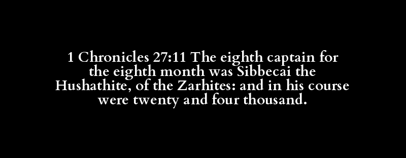1 Chronicles 27:11 The eighth captain for the eighth month was Sibbecai the Hushathite, of the Zarhites: and in his course were twenty and four thousand.
