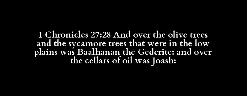 1 Chronicles 27:28 And over the olive trees and the sycamore trees that were in the low plains was Baalhanan the Gederite: and over the cellars of oil was Joash: