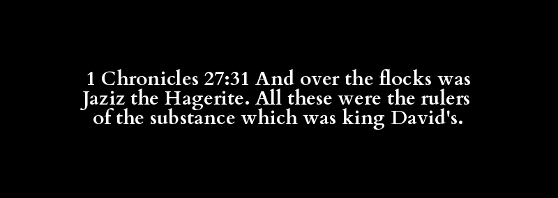 1 Chronicles 27:31 And over the flocks was Jaziz the Hagerite. All these were the rulers of the substance which was king David's.